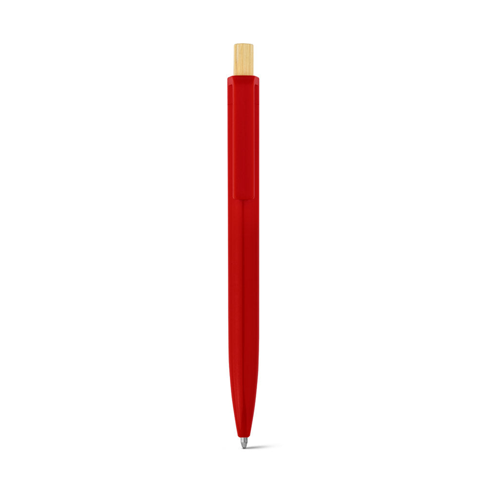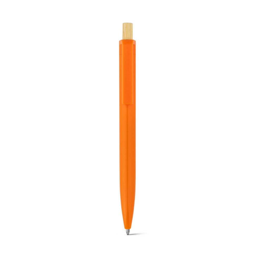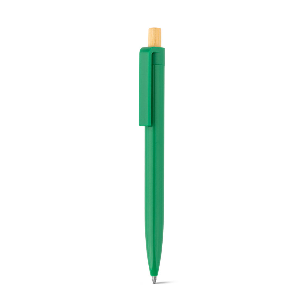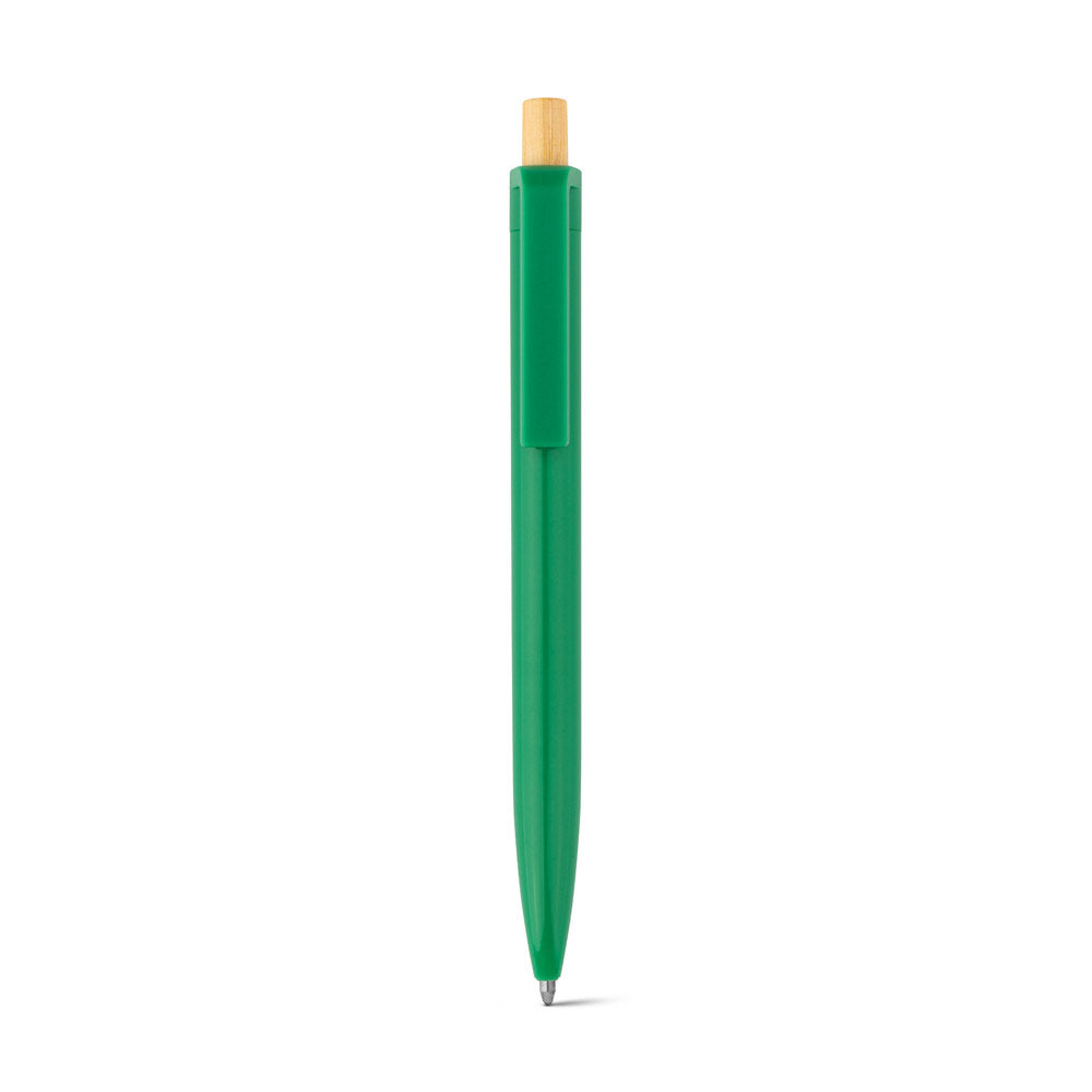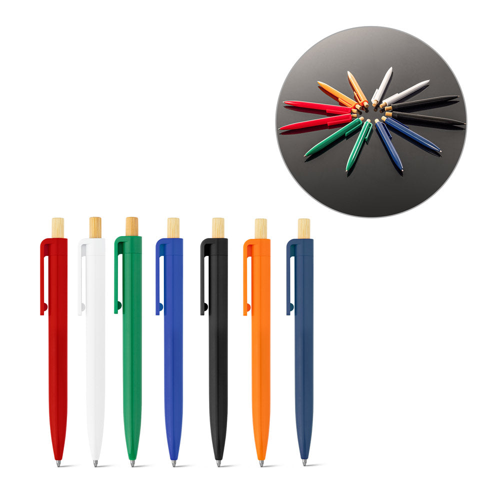 Nachhaltiger Kugelschreiber aus 100% recyceltem ABS (rABS) mit einem eleganten Druckknopf aus natürlichem Bambus. Eine umweltfreundliche Wahl für Ihre Werbebotschaft.